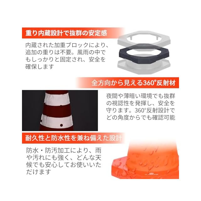 【重り設計|風にも強く安定】LZ02 Proシリーズの700mm折り畳みコーンは、ABS製の底座を使用しており、内蔵のウエイトは約1200gとなっています。これにより、重心が大幅に下がります。31cm*31cmの底座と組み合わせて、安定性が大幅に向上しています、風にもひっくり返らず安定。特に風雨の強い屋外でもその性能を発揮します。