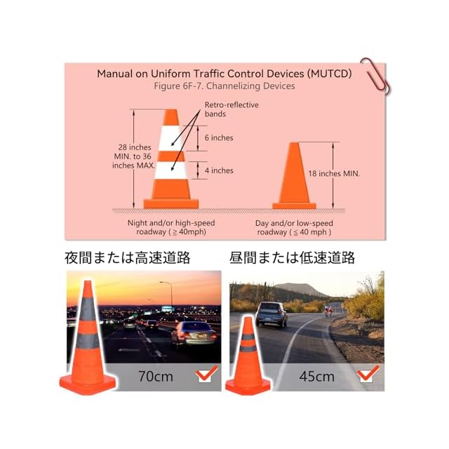 【高視認性|昼夜・悪天候対応】三角コーン LZ02 Proは、MUTCD規格に準拠した明るい蛍光オレンジと、2本の高輝度シルバー反射ストライプを採用。昼夜や悪天候を問わず遠くからでも視認しやすく、車両のライトを確実に反射して、ドライバーや歩行者の安全をサポートします。