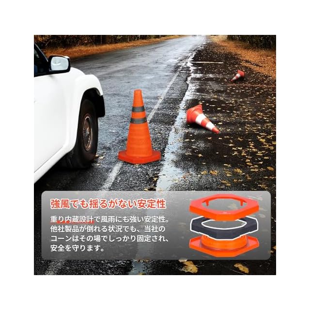 【重り設計|風にも強く安定】LZ02 Proシリーズの450mm折り畳みコーンは、ABS製の底座を使用しており、内蔵のウエイトは約500gとなっています。これにより、重心が大幅に下がります。24cm*24cmの底座と組み合わせて、安定性が大幅に向上しています、風にもひっくり返らず安定。特に風雨の強い屋外でもその性能を発揮します。