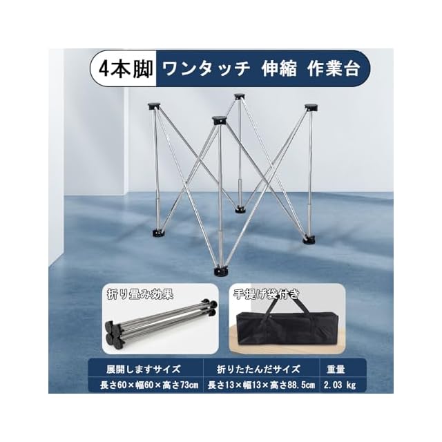 伸縮作業台 瞬速5秒設置 ワンタッチ 伸縮 折りたたみ作業台 組立不要 軽量 万能 作業デスク キャリーバッグ付き W60×H60×D73cm 4本脚