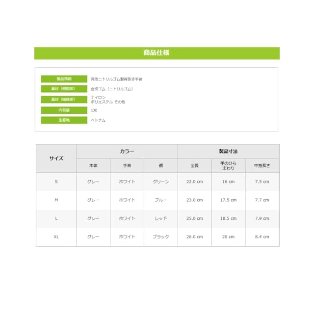 素材:(樹脂部)ニトリルゴム;(繊維部)ナイロン,ポリエステル,その他 サイズ:L 全長:25cm/手のひらまわり:18.5cm/中指長さ:7.9cm サイズ:M 全長:23cm/手のひらまわり:17.5cm/中指長さ:7.7cm サイズ:S 全長:22cm/手のひらまわり:16cm/中指長さ:7.5cm