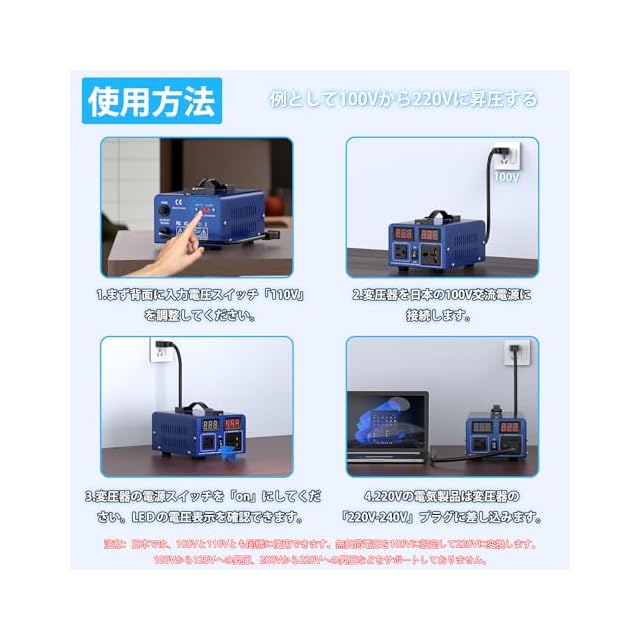 【電圧変換効率】500VA 変圧器変換効率は80%です。トロイダルトランスは電圧変換効率を高め、使用寿命を延ばします。本製品の初期設定はAC100V to AC220Vです。負荷電力に応じて出力電圧が変化します。出力電圧は入力電圧に応じてリアルタイムで変化し、一定ではありません。