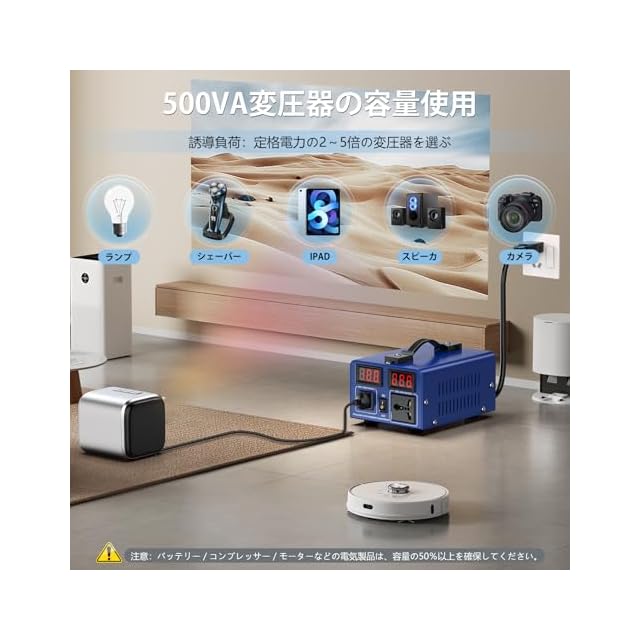 【変圧器の使用注意2】通電前に、選択した入力電圧を確認してください!高出力の電気製品やバッテリー/モーター/コンプレッサーによる誘導負荷を使用する場合、十分余裕のある容量の変圧器をお選びください。電気製品の定格出力の2~4倍を目安としてください。