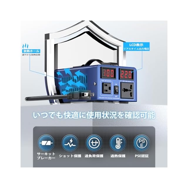 【安全機能搭載】500W 海外変圧器 OUTPUT:1口(100V-120V電気製品適用)1口(220V-240Vの電気製品適用)、10Aサーキットブレーカ保護、入力・出力過電圧保護、入力低電圧保護、過電流保護、過熱保護、超負荷保護