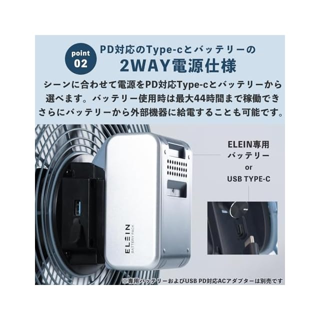 【2WAY電源で使える】利用シーンに合わせて電源をUSB Type-C(USB PD対応ACアダプター(別売)で接続)か専用バッテリー(別売)で選べます。バッテリーで使用時は最大44時間まで連続運転ができ、さらにバッテリーから外部機器に給電することも可能です。※使用環境やバッテリーの劣化具合により連続運転時間はかわることがあります。