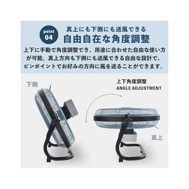 【自由自在な角度調整】手動で無段階の上下角度調節が可能です。真上方向も下側にも送風できる自由な設計で、ピンポイントでお好みの方向に風を送ることができます。