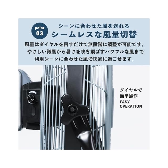 【シームレスな風量調整】風量はダイヤルを回すだけで無段階に調整が可能です。やさしい微風から暑さを吹き飛ばすパワフルな風まで細かく風が調整できるので、利用シーンに合わせた風で快適に過ごせます。