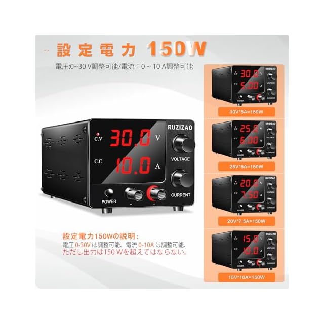 【新しいアップグレード、より高い電圧と電流の150W安定化電源】この安定化電源入力電圧は 100V~240V です、受諾可能な頻度は 50~60HZ です。そのは15V 10Aから30V 5Aの間で自由に切り替えることができます。電流を 10Aに設定する場合、電圧値は15Vを超えられず。電圧値が 30Vの場合、電流値は 5Aを超えられず。【デバイスは150Wの出力しかできませんが、心配する必要はありません、デバイスはその1つの値に基づいて、自分が設定した電流電圧の値が150Wを超えるからといって、自分で設定した電流電圧のために必要な電力が150 Wを超えることはありません。】
