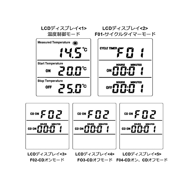 【スマートタイミングモード】 サーモスタットタイマーソケットには、F01-F04モード、F01サイクル時間制御モード、F02カウントダウンオンモード、F03カウントダウンオフモード、F04カウントダウンオン、カウントダウンオフモードがあり、時間範囲は0〜99時間59分です。