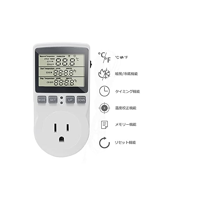 【各種機能】 暖房/冷蔵機能; °C /℉切り替え可能な機能; F01-F04タイミング機能; -9.9〜9.9℃/℉温度校正機能; 記憶機能; リセット機能
