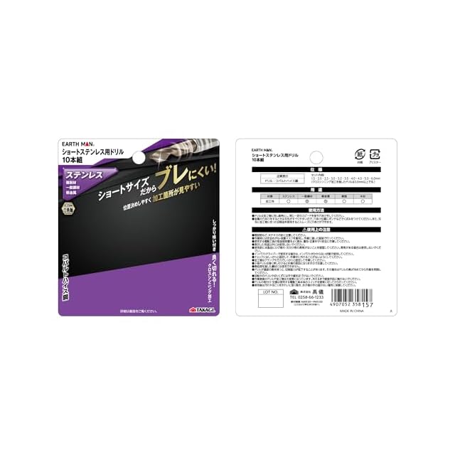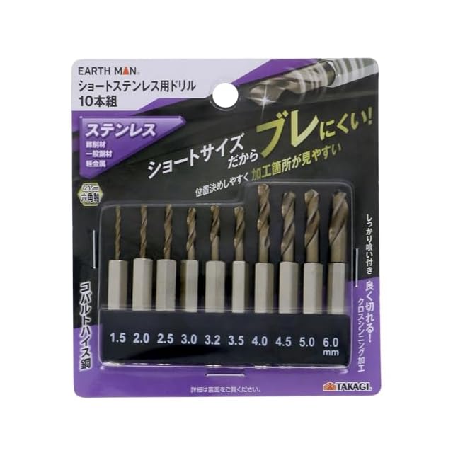 高儀(Takagi) EARTH MAN ショート ステンレス用 ドリル 10本組 6.35mm 六角軸 ショートサイズだからブレにくい 位置決めしやすい 加工箇所が見やすい しっかり喰い付くクロスシンニング加工 コバルトハイス鋼 | つむぎ屋