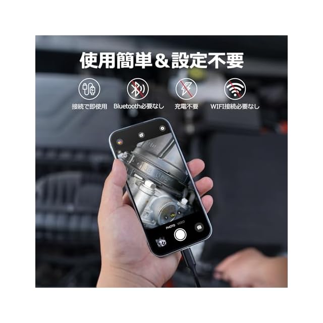 【使用簡単&充電不要】自社開発で信頼性のある専用アプリをダウンロードし、スネークカメラの端子をAndroid 端末(Android 9.0以降)・iPadのType-CポートやiPhone(iOS12.0以降)のライトニングポートに挿入するだけで使用可能になります。Wi-FiやBluetooth経由で接続する手間が一切なし!スマホから電源供給なので、事前に製品を充電する必要もありません。バッテリー搭載なしでバッテリーの耐久性を心配する必要はありません。