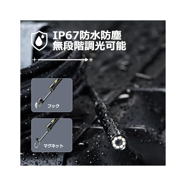 【IP67防水仕様&無段階調光可能】半剛性スコープはIP67防水仕様となっているので濡れたパイプや水中での使用も可能です。BLUART3.0技術採用し、さらに無段階調光可能な高輝度LEDが仕込まれていて、狭いところに差し込んでも光源が確保できるので、鮮明な映像を映し出します。