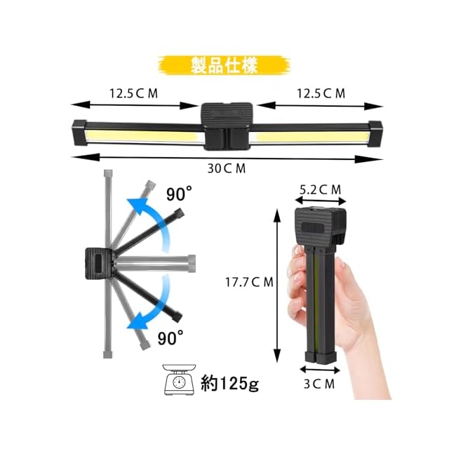 ✅【コンパクトでどこでも使える作業灯】小型軽量で持ち運び楽々!折り畳み式デザインで収納時はコンパクトに、使用時は180°調節可能なフレキシブルな照明。マグネット機能とフック付きで、工具ボックスや車のフレーム、天井などに簡単固定可能。IPX5防水仕様なので、雨やほこりの多い現場でも安心。充電式でコードレスだから、屋外作業や緊急時にも大活躍!