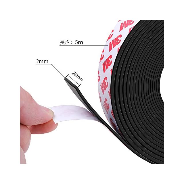 寸法: 幅:26mm、厚み:2mm、全長:5m;<br> 重さ:900g。 <br>着磁条件:700GS(ゴムマグネットの中で最も強い) <br> 耐荷重: 200gf(25mm×100mmあたり)<br> 3M粘着テープを採用、初期粘着性は無論、熱安定性や化学的安定性が優れます。