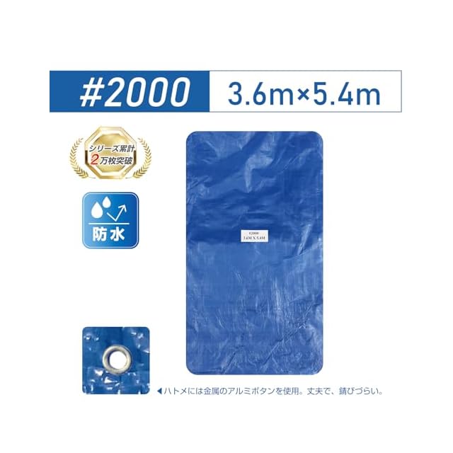 商品名:ブルーシート ビニールシート #2000 3.6m×5.4m 1枚入 ハトメ付き 中厚タイプ 災害対策 台風対策 大雨対策 防水シート 養生シート アウトドア レジャー
