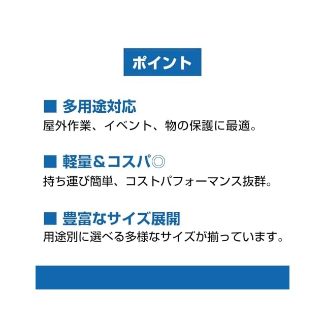 【豊富なサイズのバリエーション】ブルーシートはさまざまなサイズがあり、用途に応じて選ぶことができます。明るい青色で視認性が高く、災害時や緊急時にも役立ち、家庭用から商業用まで幅広いニーズに対応。
