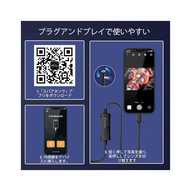 【使い方簡単】App Storeで「SUP-ANESOK」を検索し、ダウンロードしてインストールしてください。または、QR コードをスキャンしてアプリをダウンロードしてください。内視鏡カメラ付き携帯電話は、Android 4.4 以降および iOS 9 以降のシステムに適しています。内視鏡はBluetoothやWi-Fi接続を必要とせず、別途充電する必要がなく、接続エラーの心配もありません。