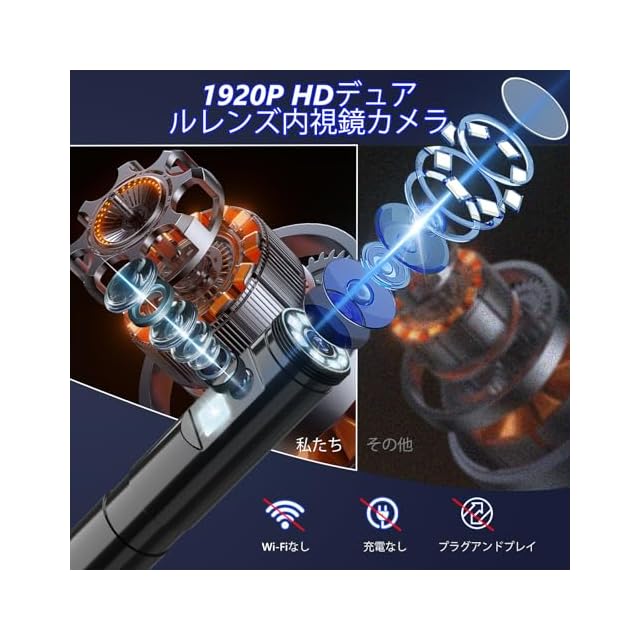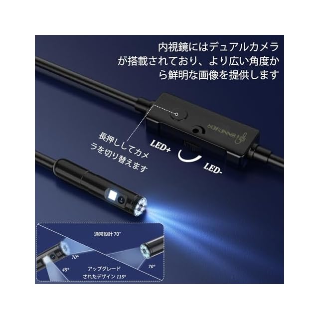 商品名:ファイバースコープ Ennovor 1920P 7.9mm 極細スコープ 内視鏡 デュアルカメラ IP67 防水内視鏡カメラ USB Typc-C Lightning接続 マイクロスコープ 充電不要 WIFI不要 Android 4.4/iOS 9.0以上対応 専用アプリ付属 8+1 個高輝度LED搭載 家庭用 機械検査 独立研究 5m 半硬質ケーブル 12ヶ月