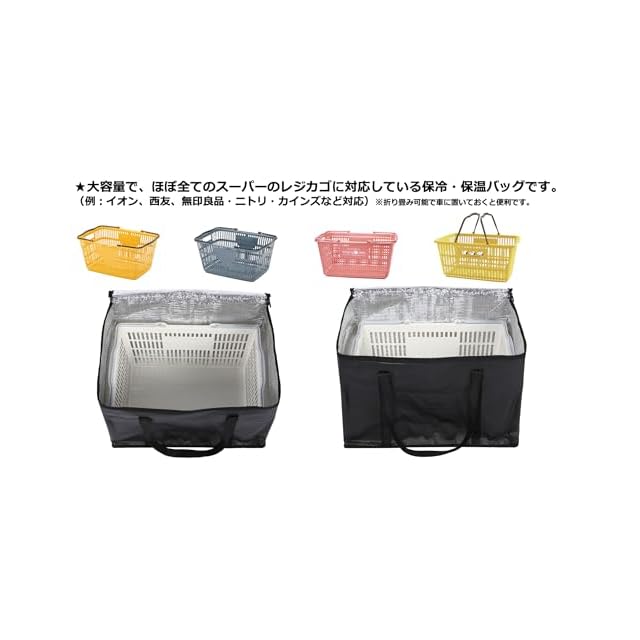 ★2020年にレジ袋の有料化がスタートしてから、たくさんのスーパーに広がっている「マイレジカゴ」 スーパーの他にも、イオン、西友、無印良品・ニトリ・カインズなどのホームセンターでも手に入れることができます。 ★Kiryuizeの[レジカゴがスッポリ入る保冷・保温バッグ]は、一般的なマイレジカゴにほぼ全て対応しています。 確認した25社のレジカゴは、ゆとりを持ち、スムーズにスッポリ収納できることが確認できました。