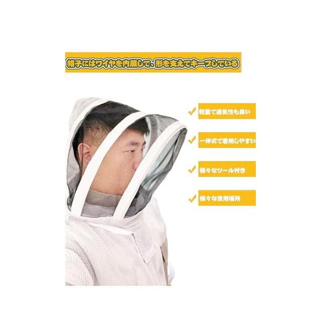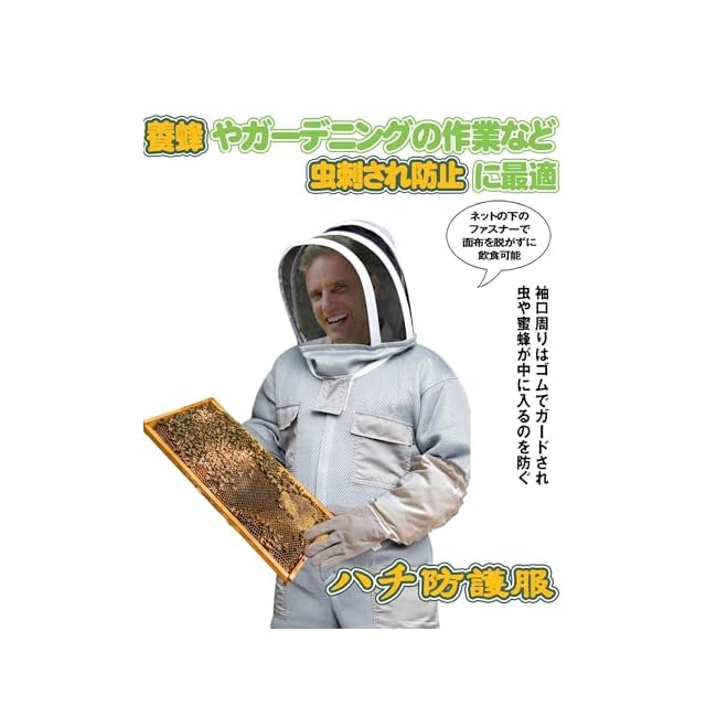 【こだわり】■フェイスネット:フェイス下のチャックがあり、服を着たまま顔が出せますし、途中での飲食も容易で便利です ■手首・足元をゴムでしっかりガードしており、虫や蜂の侵入を防ぎます。 ■顔面部分はメッシュ生地、ほかの部分は通気性も良く夏場の作業も快適です。 ■ウエスト部分には便利なポケットがあり、さまざまなアイテムが収納できます。 ■脱着がしやすくて便利です。