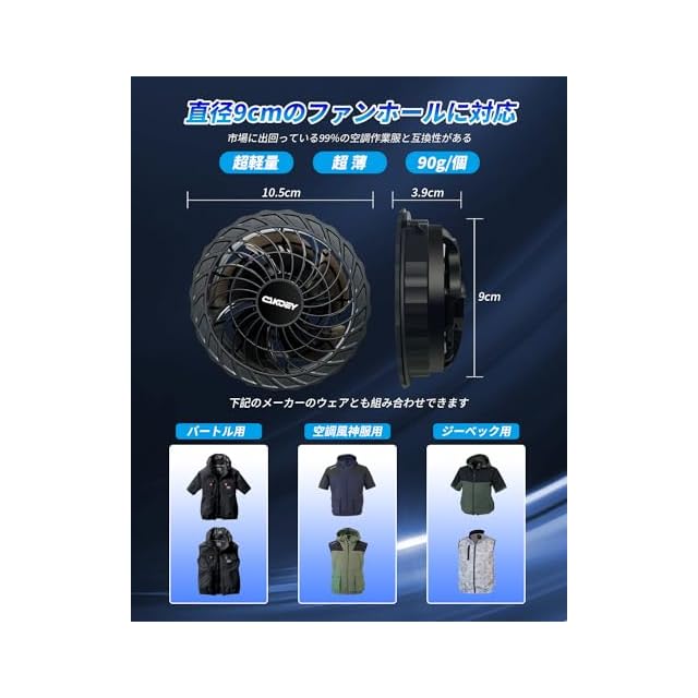【幅広い利用シーン・熱中症対策】ファン取り付け部の直径サイズは9cmで、市販の99%の空調作業服、空調ベスト、空調パンツに対応でき、互換性が非常に高いです。工場現場や外仕事などのエアコンの使用できないような環境で作業する人たちにとって最適な夏の猛暑対策グッズです。現場仕事、配達作業、倉庫内作業、通勤、通学、ハイキング、釣り、スポーツ観戦など様々なシーンで活躍できます。