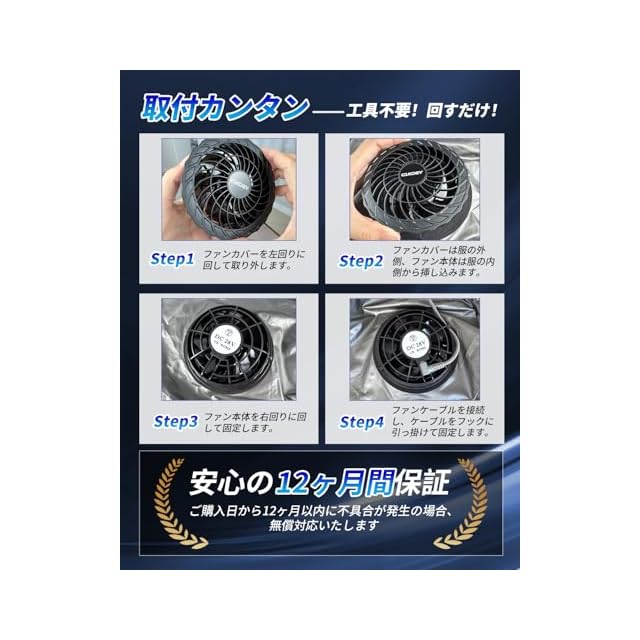 【取り外し可能なファンカバー・掃除が簡単】ねじ込み式の作業服 ファンは工具不要、両手でファンのカバーを回すだけで簡単に取り外し、プロペラ部分の清掃が可能です。また、冷却ファンは配線コードの抜け止め設計により、ケーブル接触不良を解消、電源プラグをしっかりと固定させ、ファンへの給電がもっと安定になります。