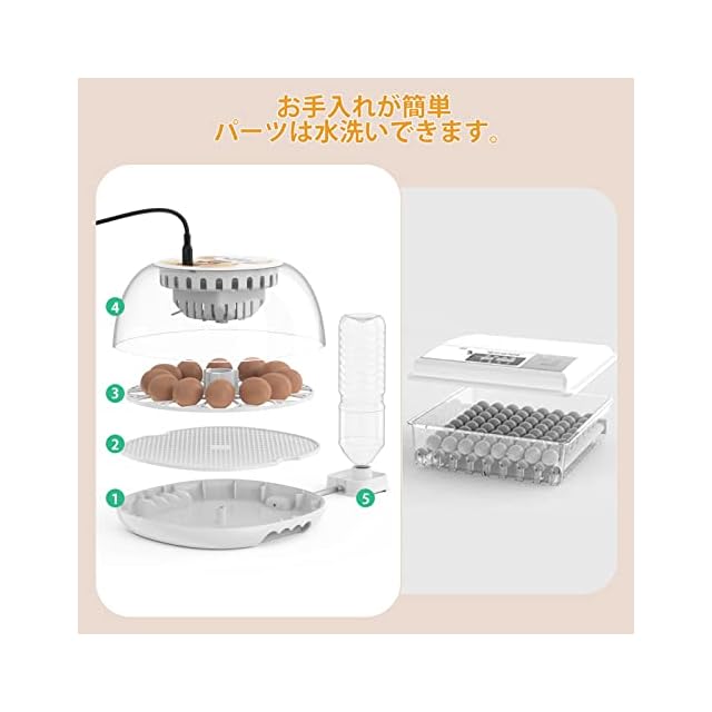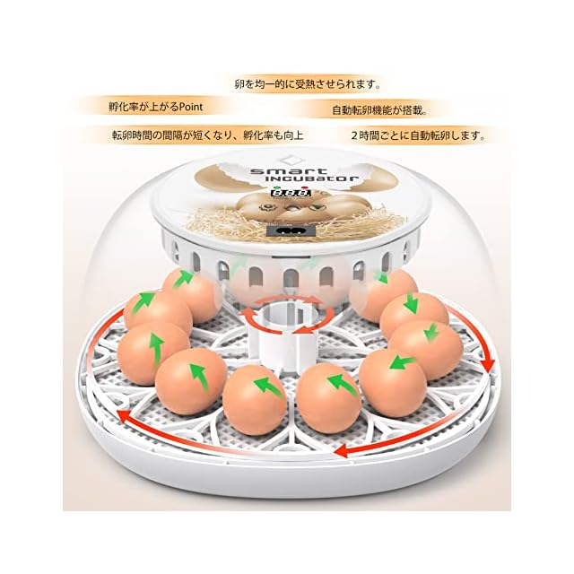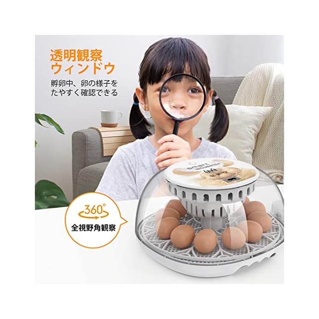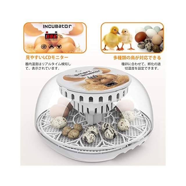 【孵化状況がたやすく確認】透明な観察ウィンドウにより、卵の状態がはっきりとよく見えます。孵化中に全ての卵の発育状況をたやすく確認でき、孵化のプロセスも観察しやすいです。機内温度をリアルタイムでデジタル表示します。今孵化の温度は一目で分かります。【お手入れしやすい分離式】パーツとアタッチメントは水洗いできます。お手入れはお手間かかりません。
