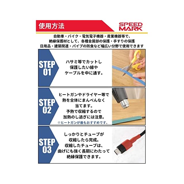【熱収縮チューブの使い方】熱収縮チューブをはさみなどで使いたい分だけカット。線やケーブルを中に通してヒートガンやドライヤーなどで熱を全体にあてます。予熱で収縮していき、チューブが縮んだら完成です。