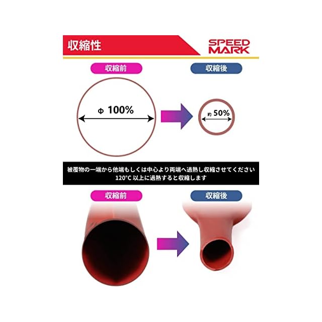 【収縮率2:1で収縮が速い】熱収縮チューブは、ヒートガンやドライヤーで急速に収縮できます。収縮率は2:1。収縮温度は120度以上で、加熱後の予熱で縮んでいきます。