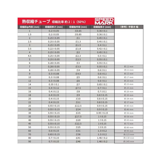 【欲しいサイズを選べる】熱収縮チューブは10mmをはじめとした32サイズの内径。収縮前サイズは1mmから大口径90mmまで。1mmから5mmまでは0.5mmごと、それ以上は10mmごとあります。
