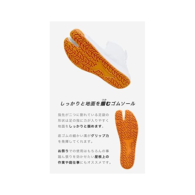 指先が二つに割れている足袋の形状は足の指に力が入りやすく地面をしっかりと掴めます。底ゴムの細かい溝がグリップ力を発揮してくれます。