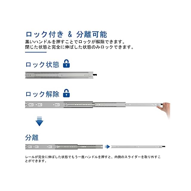 ロックイン&ロックアウト設計 --- スライドは3つ折りで完全に拡張できます。 全閉時と全開時にロックがかかり、任意にスライドを防止できます。 黒いハンドルを押してロックおよびロック解除します。