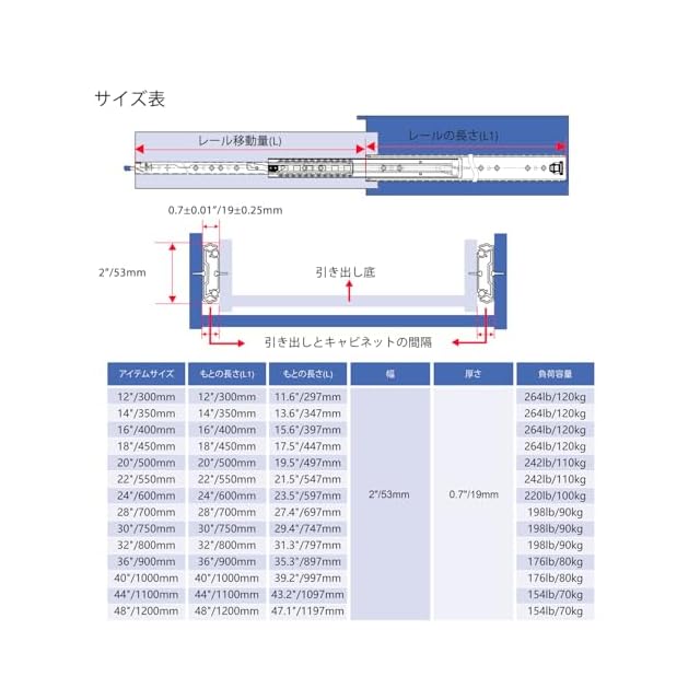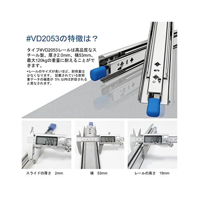 最大120kgの重耐荷重 --- #VD2053シリーズは幅53mm、厚さ2.0mmの最高品質のスチールで作られているため、耐荷重性能に優れています。 スライドレールが長くなると耐荷重が減ります。 記載されている耐荷重データの偏差が 5% 未満であれば、別の用途で許容されるとみなされます。