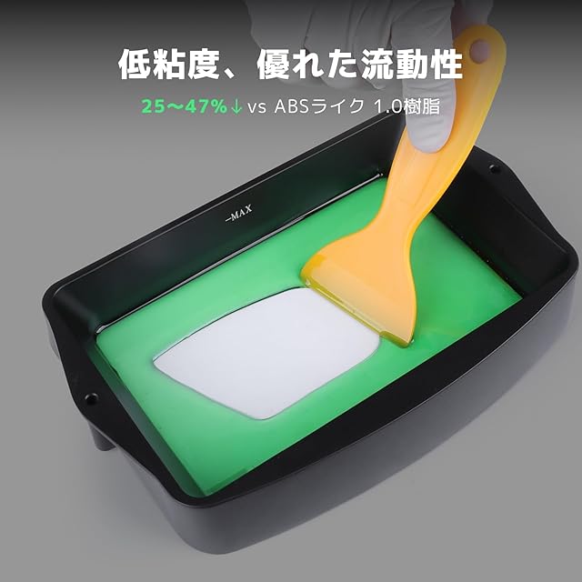 【流動性が良く、硬化が早い】ABS 類似樹脂 3.0 はABS-like 1.0やABS-like 2.0よりも25~47%低く、樹脂が素早く印刷領域に戻り、剥離フィルムから容易に剥離することができます。これにより、印刷の成功率が向上し、全体的な印刷時間が短縮されます。