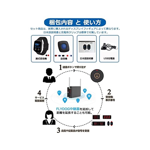 呼び出しベルポケットベルシステムは何ができますか?FLYDOG呼び出しベルウォッチポケットベルは、あなたのゲストのための優れたサービスを提供するために正確な通話信号を持つファッショナブルなデザインと利便性を持つポケットベルをお探しの顧客に最適です。ワイヤレス通話システムは、広くレストラン、クリニック、ホテル、コーヒー、家、KTV、バー、工場、スーパーマーケット、サロン、スパ、キッチン、またはどこでも顧客がサービスを待っている場所で使用されています:ゲストとスタッフの間のインスタント接触。より迅速なサービスで利益を増やします。 ゲストが任意のサービスを必要とするとき、ちょうどボタンを押すと、机番号が振動とに表示されます。 誰かに注意を引くために怒鳴る必要はありません、ウェイターはゲストに効率的で暖かいサービスを提供します。ワイヤレス呼び出しベルウォッチポケットベルシステムの特徴:ウェイターポケットベルシステムは、簡単に操作できるOLEDスクリーン、 シンナー、ライター、より柔軟なプロンプトモード:振動とディスプレイサービステーブル番号内蔵の充電式リチウム電池を内蔵し、200個以上のシングルキーおよびマルチキートランスミッターに一致する受信範囲:オープンエリアで200m / 656ft、30-50m / 98-164ft屋内受信距離をサポートしています。標準:IPX67バッテリー:CR2025内蔵バッテリー形状:ダイヤモンドサイズ:直径2.2インチ/56mm、厚さ0.35インチ/9mmパッケージ含まれています:1 *呼び出しベルポケットベル;1*USBケーブル;2*コールボタン。1*英語マニュアル