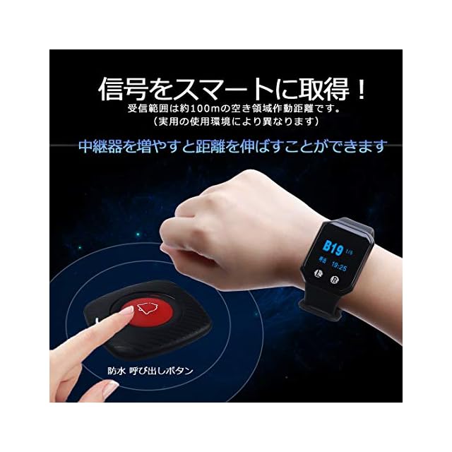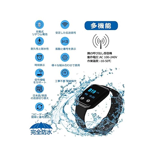 【多機能で完全防水】防水レベル:IPX67;注意方式:表示番号+振動;2種類の呼出表示:3桁の1番号+呼出種類、2桁の4番号;2つの言語の変換:日本語/英語;受信機データのコピー。