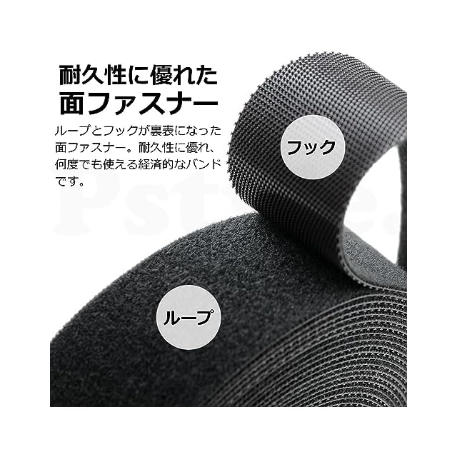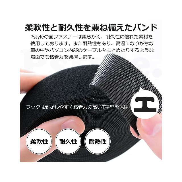 【柔軟性と耐久性を兼ね備えたバンド構造】 Pstyleの結束バンドは柔らかく、面ファスナーのフックは剥がしやすく粘着力が高いT字型を採用しております。耐熱性もありますので、高温になりがちな車の中やパソコン内部のケーブルをまとめる場面でも粘着力を発揮します。