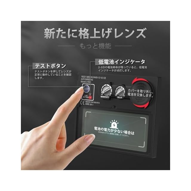 太陽光発電と交換可能なリチウム電池(CR2450)併用。高品質PP素材採用、ANSI Z87.1、EN 379、CSA Z94.3、EN ISO 16321規格準拠。