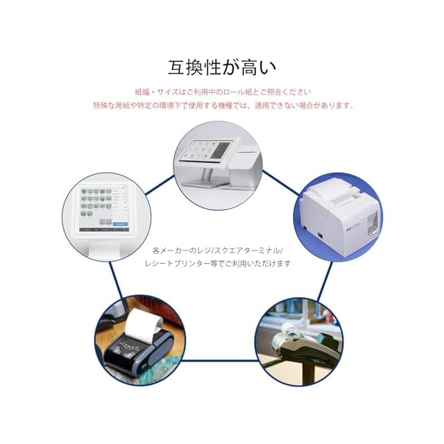 ✅【互換性が高い】各メーカーのレジ/スクエアターミナル/レシートプリンター等でご利用いただけます。(紙幅・サイズはご利用中のロール紙とご照合ください)