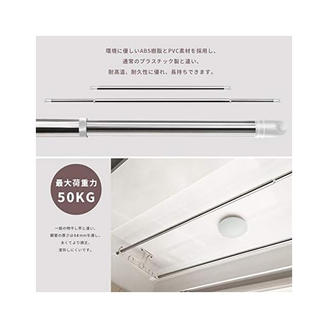 高い耐荷重性能 日常使用における利便性:最大耐荷重は35kgで、布団、毛布などの重い物品も安定して晾晒可能。ただし、調整した長さに応じて耐荷重範囲が変動するため、使用前に長さに合わせた承重を確認ください。 収納時には最短1.0メートルに縮められるため、押入れや戸棚にコンパクトに収納でき、住宅のスペース節約ニーズに合致します