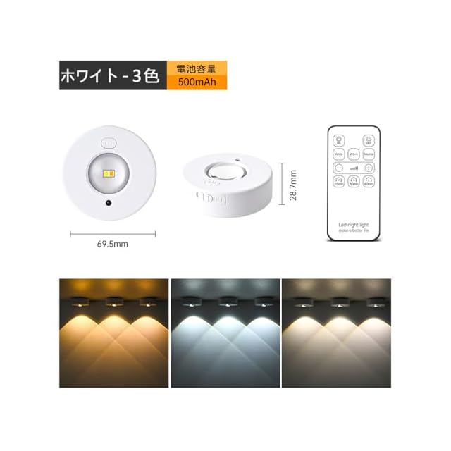 【商品仕様】◉商品名:LEDキャビネットライト◉消費電力:0.3W ◉入力: 2.8-5V◉重さ:約65g ◉演色性:Ra80 ◉材質:ABS ◉色温度:3000-6500K【パッケージリスト】タッチライト×3、USB-3-in-1 充電ケーブル ×1、防塵袋×3、説明書×1、リモコン×1、金属テープ×3。キャビネット、クローゼット、廊下、階段、寝室、ショーケースライト、ディスプレイ化粧鏡、本箱、リビングルームなどに適用。ご注意するのは高温の湿っぽい環境下で使わないでください。