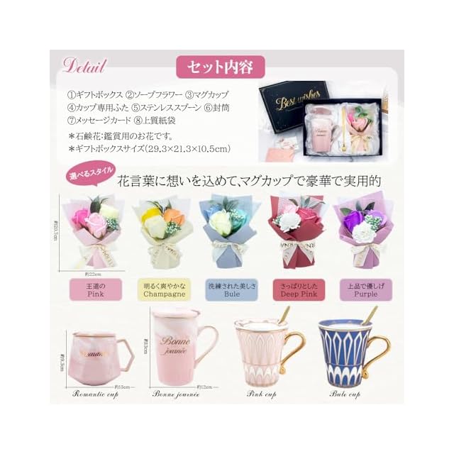 【セット内容】①ギフトボックス×1 ②高級ソープフラワー×1 ③ 約400ml マグカップ×1④カップ専用ふた×1⑤ステンレススプーン×1⑥封筒×1、⑦メッセージカード×1(メッセージを書き込めます)⑧上質紙袋×1。【素材】陶器 ご注意※オーブン・電子レンジ・食洗器使用不可。【期間】商品が不具合のあった場合は商品レビューをする前に弊店まで気軽にご連絡ください。弊店はできるだけ迅速にお客様の問題を解決します。ご安心に購入してください。*ソープフラワーはお届け後、軽く形を整えていただきますと、より一層美しさが引き立ちます。