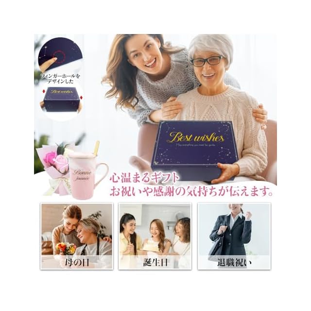 【お洒落なギフトボックスで贈り物に最適】贈る人も、受け取る人も満足できるギフトボックスセットをご用意しました。高級感あふれるボックスと豪華な紙袋のセットなので、ラッピングの手間なく、そのままの状態で気持ちを伝えられます。改良型フィンガーホールデザインは、カップとソープフラワーをしっかり保護しながら、驚くほどスムーズな開封を実現して贈り物を解くプロセスそのものが特別な儀式へと変わります。「大切な人への贈り物」にぴったりな、至福のギフト体験をご提供します。母の日プレゼント、退職プレゼント 女性、還暦祝い 女性、birthday gift for women、誕生日プレゼント女性、敬老の日、送別会、お別れ式などに最適です。