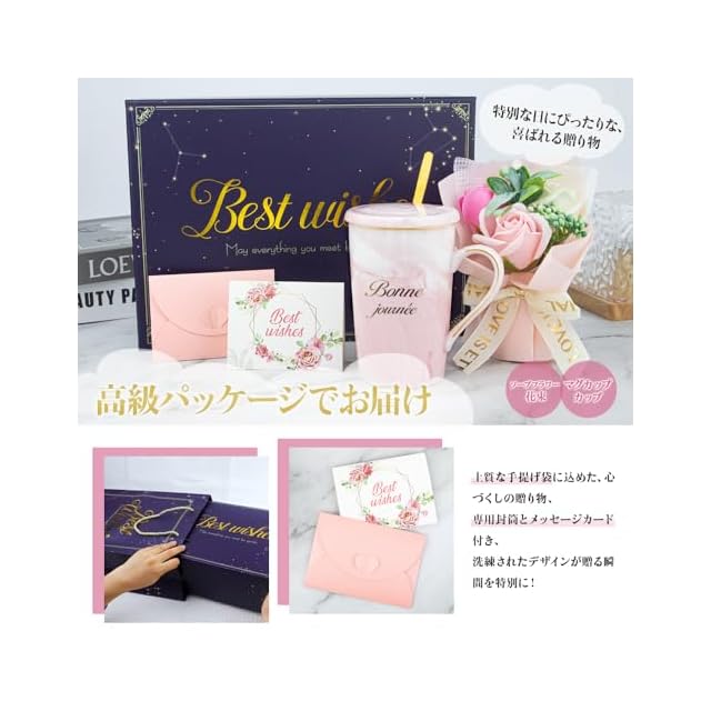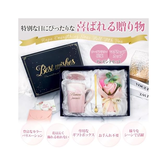 【商品内容】:セット内容:①ギフトボックス×1②高級ソープフラワー×1、③上質紙袋×1、④マグカップ300㎖×1、⑤カップ専用ふた×1、⑥ステンレススプーン×1、⑦封筒×1、⑧黒金のメッセージカード×1(メッセージを書き込めます)⑨シール×1;【素材】陶器 ご注意※オーブン・電子レンジ・食洗器使用不可。上品なピンクの欧風マグカップと高級ソープフラワー、黒金のメッセージカードのセットは、三つの調和が、『あなたの毎日が幸せで包まれますように』という私たちの願いを、朝ごと夜ごとにお届けします。