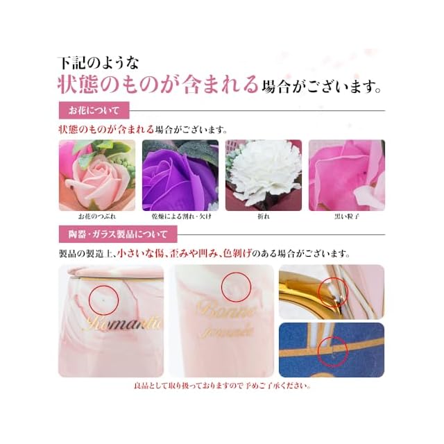 【期間】商品が不具合のあった場合は商品レビューをする前に弊店まで気軽にご連絡ください。弊店はできるだけ迅速にお客様の問題を解決します。ご安心に購入してください。*ソープフラワーはお届け後、軽く形を整えていただきますと、より一層美しさが引き立ちます。