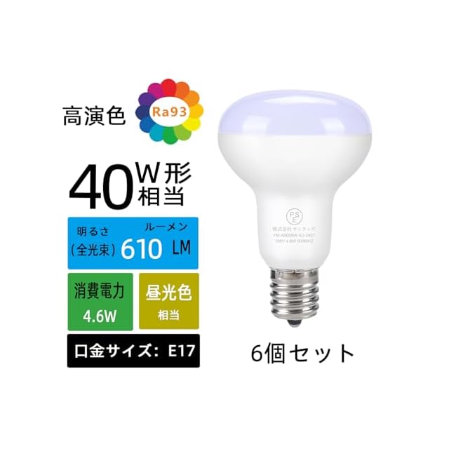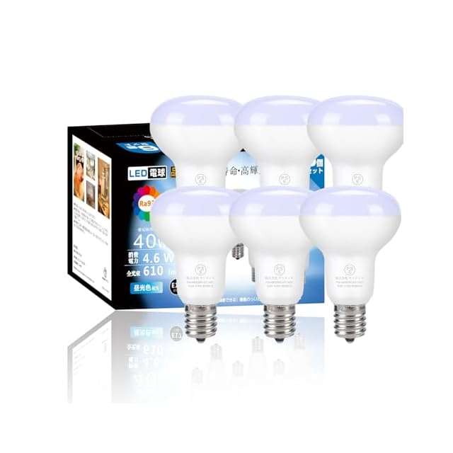 LED電球 E17口金 ミニレフランプ形 高演色Ra93 40W形相当 昼光色 610lm 下方向 ミニレフ電球 密閉形器具対応 省エネ キッチン 台所 トイレ リビング ダイニング 脱衣所 寝室 廊下 玄関照明用 レフ電球 6個入 E17 昼光色 | つむぎ屋