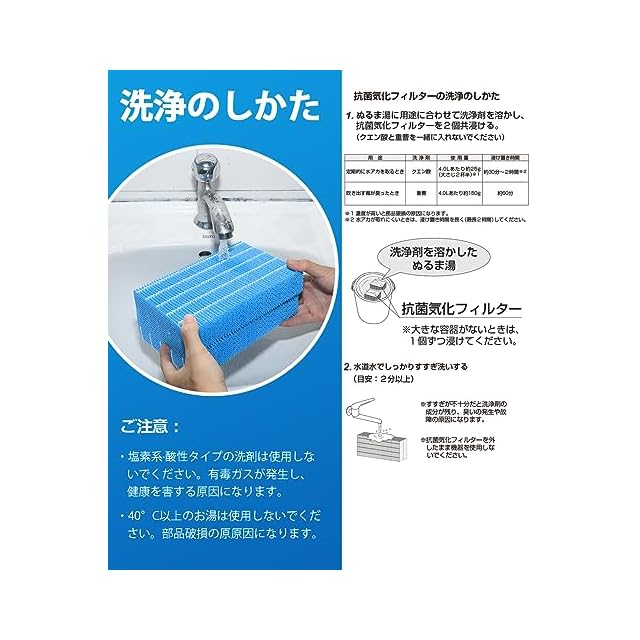 【お手入れの目安】2 週間に 1 回。加湿器フィルターの寿命を確保するため、定期的に洗浄してください。※吹き出す空気がにおったり、加湿量が少なくなってきたときもお手入れしてください。お手入れせずそのまま使用すると、本体内部が高温になる・加湿量が低下する・異臭がするなど故障の原因になる。