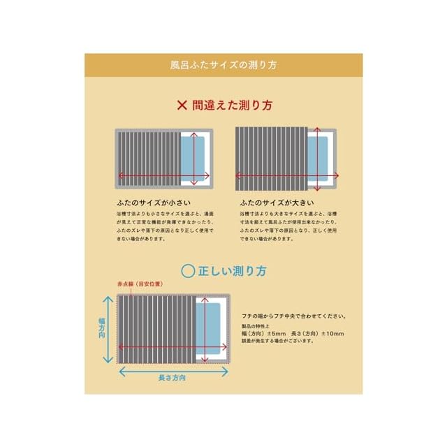 【注意】・商品を選びの際は浴槽のふちに十分かかるサイズをお選びください・商品の特性上、幅方向に対して±5mm 長さ方向に対して±10mm程度の誤差が生じる場合がございます・24時間風呂でのご使用はお避け下さい