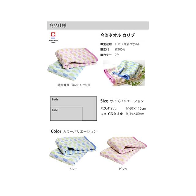 【バスタオル 2枚セット】生産地:日本(今治タオル 認定番号:第2014-297号) 素材:綿100% サイズ・重さ:約60×116cm 約222g カラー:ブルー、ピンク セット内容:バスタオル 同色2枚、またはアソートメント2枚(ピンク+ブルー)